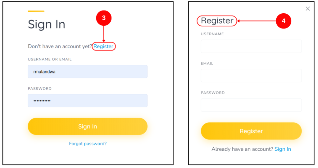 Once there click ‘Register’ since you don’t have an account yet. A user registration form will appear, where you will add your preferred username, email address and password (at least 8 characters).